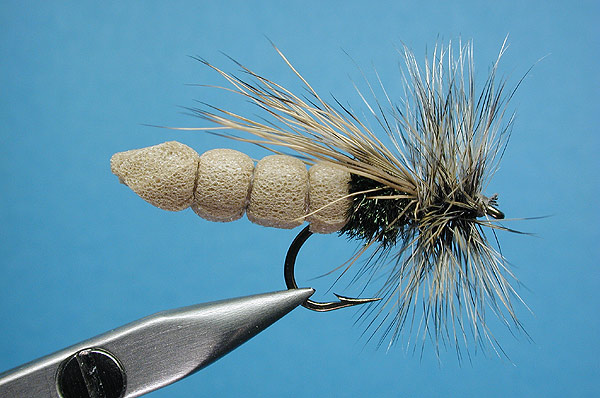 tan foam tied separately on a needle, peacock herl to cover tie-in point