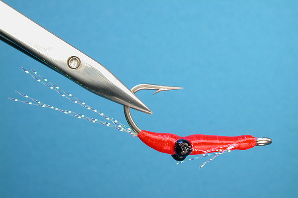 Note: California saltwater surf dropper fly, Barred Surf Perch ghost shrimp attractor.