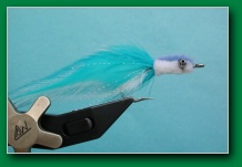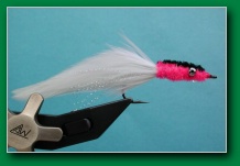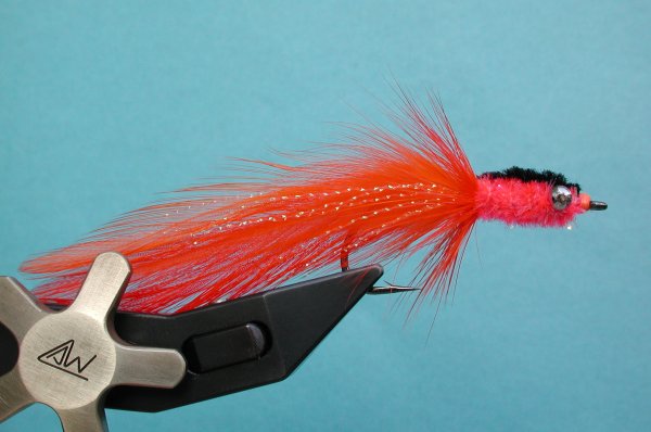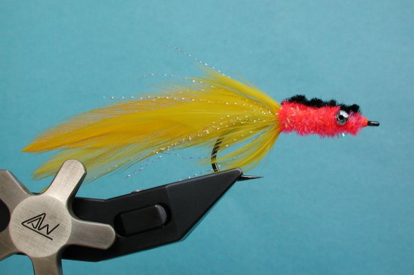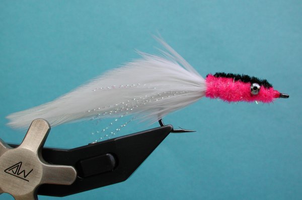 | Head: | size 3 Salt water chenille, with the darker chenille tied in at the back, and laid over the top of the lighter chenille and tied off behind the eye of the hook |