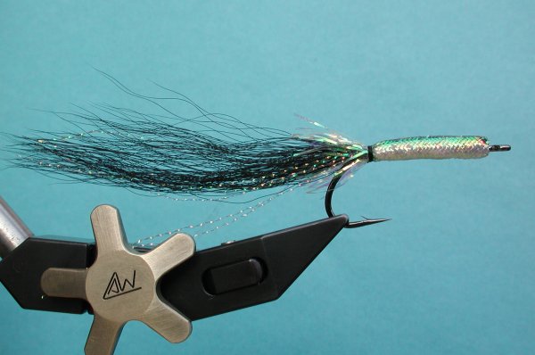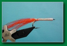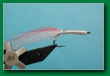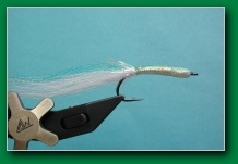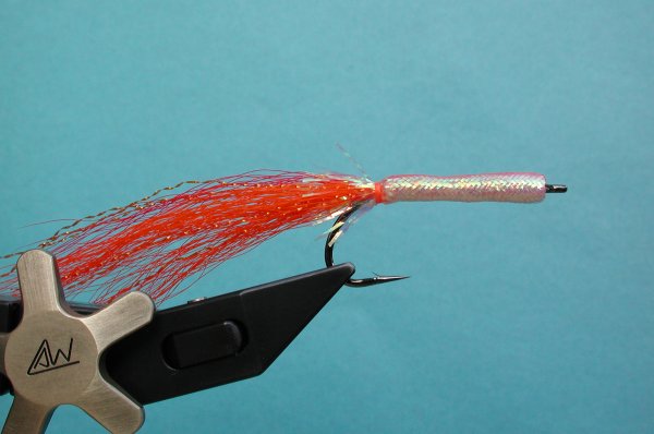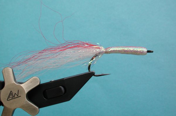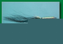 | Body: | pearl tube over some strands of bucktail over chenille tied on hook, then coated with epoxy |