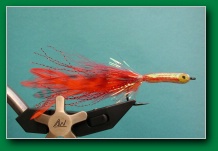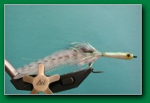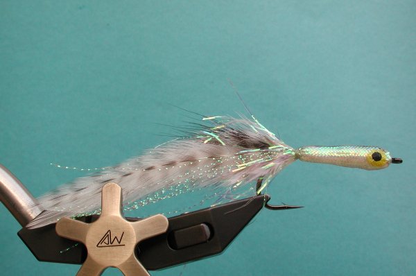| Body: | pearl tube over some strands of bucktail over chenille tied on hook, then coated with epoxy |