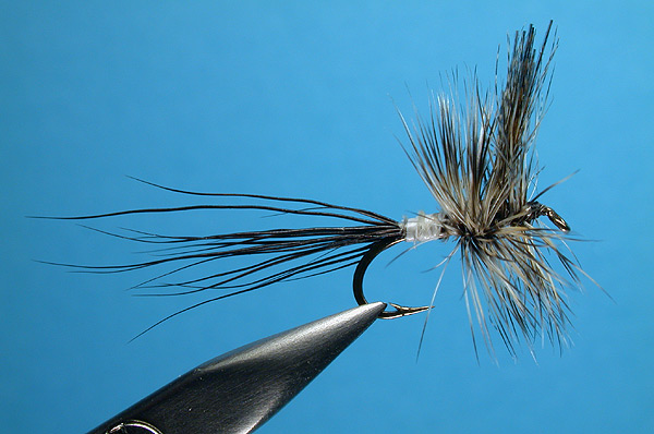 This fly produces well in the evenings most all summer long in the Sierra Nevadas. The thorax style tie allows the fly to sit forward more as it floats. The biots come from the leading edge of the primary flight feathers of wild Rio turkeys, the same striped quills that are used for winging King's River Caddis and Joe's Hoppers.