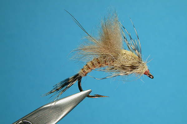 | Wingcase: | Appropriately colored (tannish) synthetic dubbing with long fibers, twisted to form a rope and tied in like a wingcase. This imitates the dun “breaking-out” of the nymphal shuck. |
