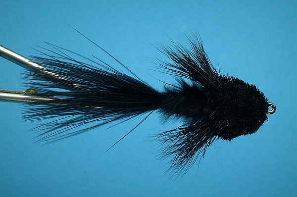 | Head: | Black Deer Hair spun and clipped wide and flat. Tips left unclipped on side for pectoral fins. |