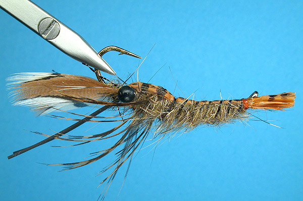 Notes and fishing instructions: Crawfish are a very important component of the diet if trout on many streams here in central Missouri. This pattern was created to emulate the appearance of the crawfish in the Little Piney River. The black spotted pattern of the fly is created using a dark brown permanent marker applied to the raffia shell. Dead drift it into the deep holes, and the bump it up and down during the deepest part of the drift. At the end of the drift you can strip back upstream slowly. Expect violent strikes when the fish takes the fly and it works equally well on trout and small mouth bass. |
