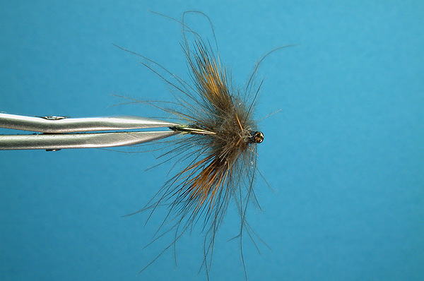 | Hackle: | CDC fibers, trapped in dubbing loop, spun before wrapping |