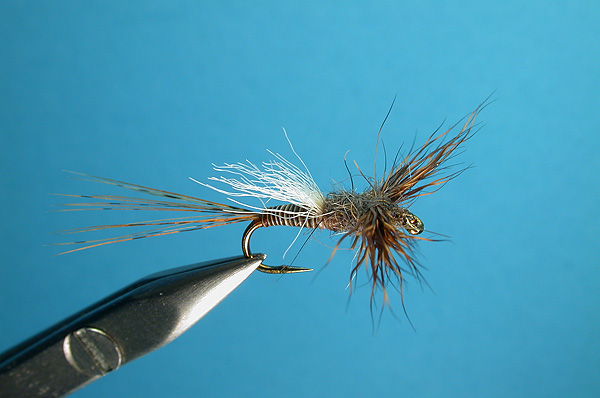| Hackle: | saddle or microbarb hackle tied parachute style around wing |