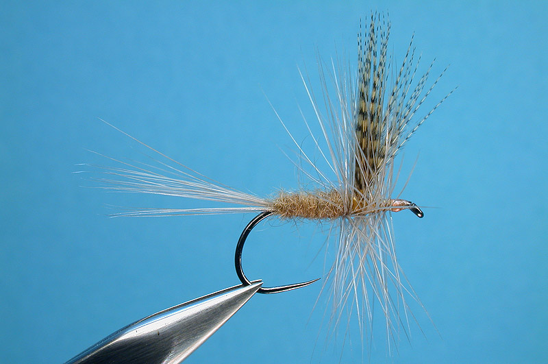 | Note: Legendary Catskill pattern developed by Roy Steenrod ca 1920 and later named after his friend AE Hendrickson. Tied to imitate the female "Ephemerella subvaria". This one should have "Urine stained vixen fur" for the body to get the correct pinkish tan colour... Anyone have some, please contact me.. | Back to Thumbnails |