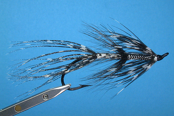 | Body: | 4 black, 8 white floss and 4 silver third braided for the rear half. Between the sections a black cock hackle. Front half 8 white and 8 black floss braided. |