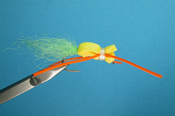 Note: This is my variation of Jack Gartside’s renowned Gurgler. I tie it with a more pronounced lower “lip” to create a cupped popper face. It also resembles a large foam beetle with a tail! Whatever it is, it is my favorite and most frequently used surface fly for warm-water species. Size 8 works well for the panfish and small bass I find in local farm ponds. Size 4 works nicely when targeting larger bass. Tip: For a nice bass bug on a size 4 hook, cut your foam slightly wider. You might try slightly thicker foam (I use an evazote foam from Rainy’s) or two layers of foam of the same or different colors. |