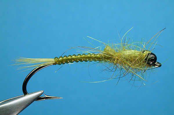 | Wing: | Mixture of pale olive squirrel and insect green SLF, tied buggy |