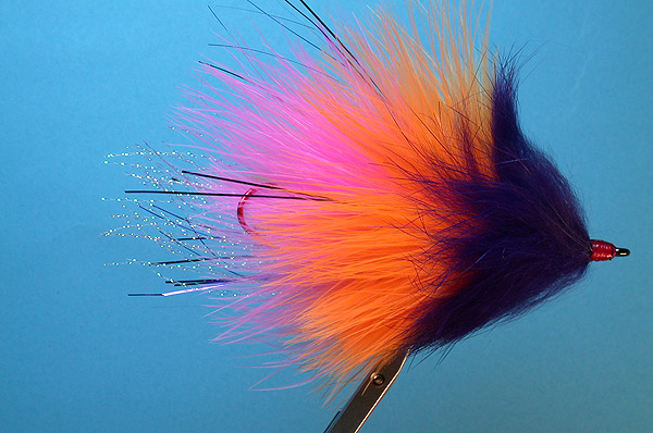 | Body: | Marabou plumes - 3 turns pink, 3 turns orange, Krystal Flash or Flashaboe - purple |