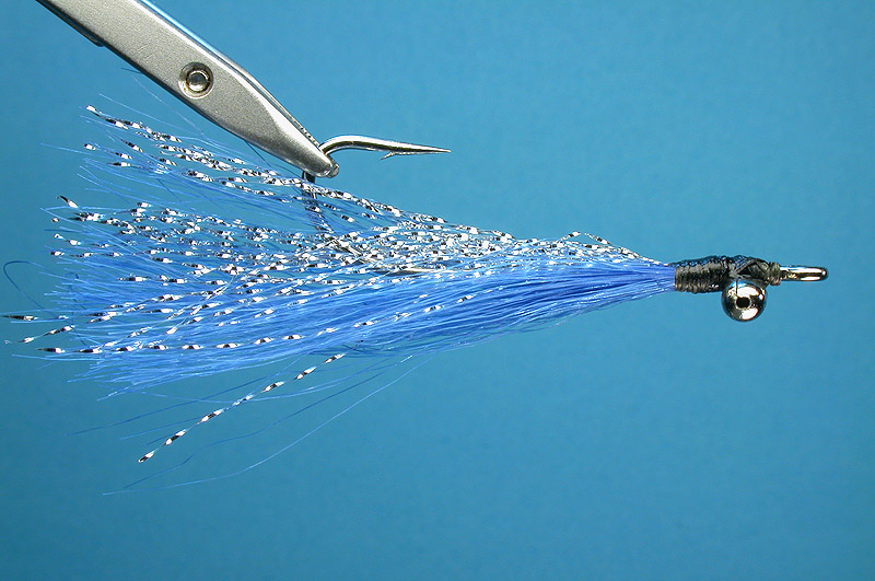 - Tie in a a small batch of blue Fish Hair on top of the hook and make it the same length as the silver Krystal Flash.