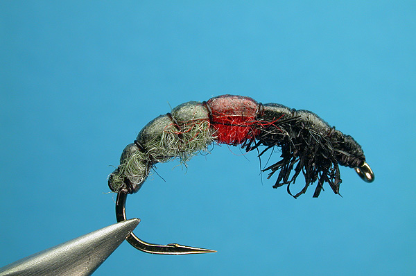 | Abdomen: | 2/3 grey dubbing, 1/3 scarlet dubbing |