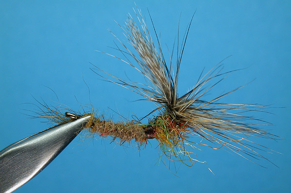 | Thorax: | blended olive seal & hare's mask fur |