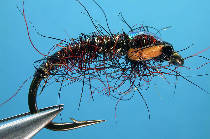 | Abdomen & thorax: | Seals fur mix - Black/red/claret, plus a pinch of gold Lite-Brite |