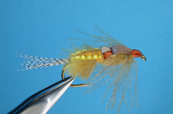 | Thorax: | Yellow antron and yellow hare/opposum dubbing |