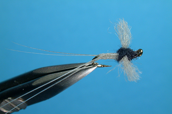 Note:On the midges, when tying in the spinner style wing, well waxed thread adds more control. Take one - two wraps with the waxed thread before tying the wing in. |