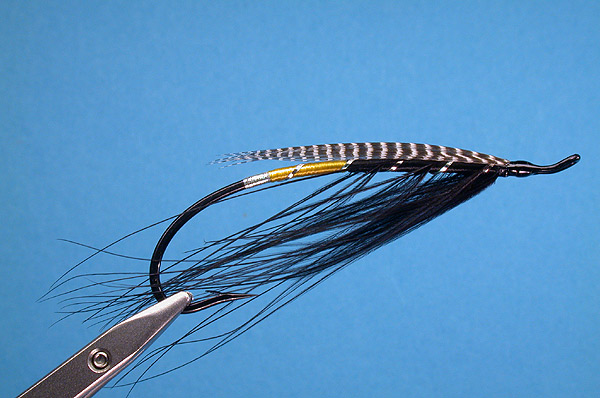 Hackle: two turns of blue eared pheasant, dyed black, with a small long bunch of the same tied as a beard