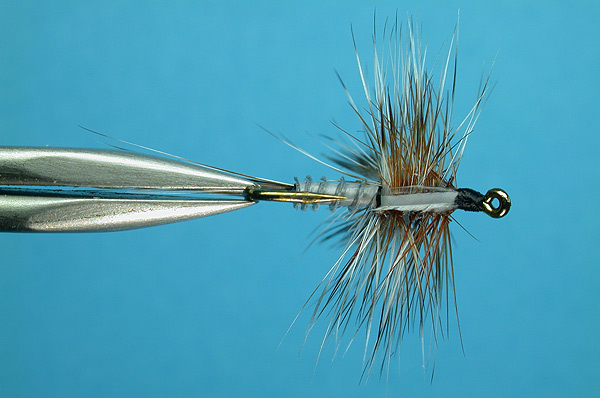 | Hackle: | Brown and Grizzly rooster |