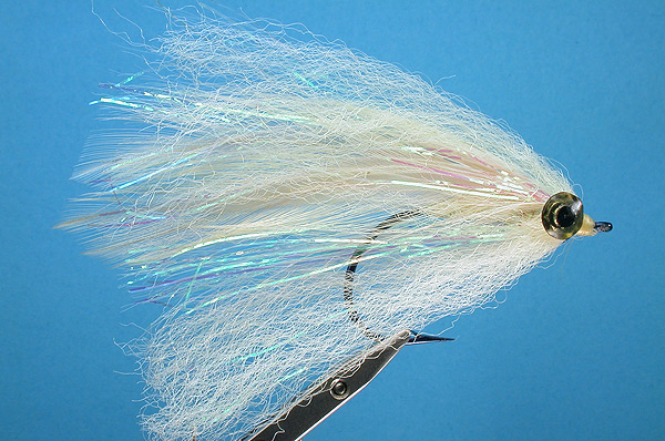 Bottom to top: four white hackles, synthetic white hair, Spectraflash hair