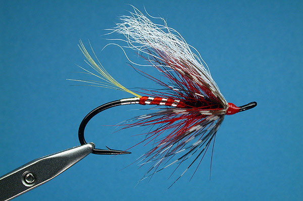 Pattern information: This is a remarkable Spey fly when you add spey hackle in place of the standard hackle and a low white quill wing. The initial concept of this fly came when I noticed that although red and black are regarded as effective Steelhead and Salmon colours, there are few flies that incorporate both in one pattern. The dark body and red highlights seem to be good at attracting fish without spooking them. I've never fished Ceann Mor, but I hope to someday. Reports from the continent say it works well in my ancestors' Perthshire, Scotland. |