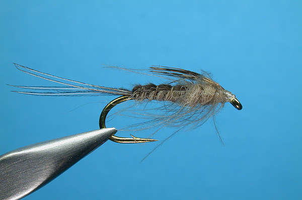 Pattern information There are plenty of good nymph patterns out there that are fairly close to the Western March Brown (Rithrogena morrisoni), but when the water becomes clear, the trout become quite selective. This fly has the shape, coloration and movement of the natural, and that can often make the difference between "troutless" and "troutful" days. The fly also features inexpensive materials and is quite easy to tie, which is a redemptive quality when the tippet size drops to near invisibility, and flies snap off frequently. (Turkey, pheasant and other birds can be substituted if you don't have grouse.) The fly can also be tied with a gold beadhead. |