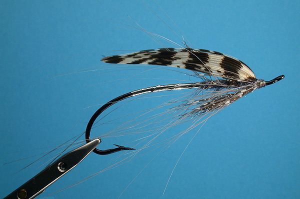 Pattern information With its shiny, translucent body and low-set, mottled wing, this Spey fly is a dead ringer for a salmonid fry of various kinds. In Summer, you will find Atlantic Salmon (and Steelhead) busting juvenile baitfish for various reasons. This fly works very well under these conditions. I do not recall ever catching a fish on this fly under any conditions other than sunny skies. It is so brilliant that you stand a chance of frightening fish if you fish it in the shade or on cloudy/overcast days. I suppose that a Jungle Cock eye would complete the baitfish look, but it works just fine without them, so I'll save them for the display flies. |