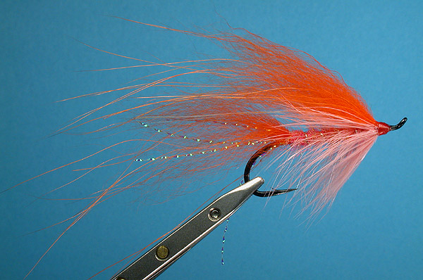 Note: This is a very bright orange - leaving it in the sun for awhile will cause it to fade and turn a nice "shell orange" shade. Keep the wing short to prevent fouling around the hook. The soft underfur should not reach much farther than the hook bend. (The KF will keep the tail from fouling.)