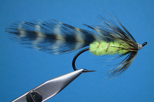 | Wing: | match pair of small, olive dyed grizzly neck feathers (hen) |