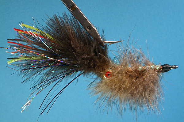 Note: This fly was created to pitch to grass and cover. Casts should be no more than 25 feet. It is fished with short, quick strips. It is highly impressionistic. I wanted to imitate the fleeing motion of a Crayfish. At times it is best fished lying motionless for an agonizing period of time, then stripped off the bottom, where most strikes occur. Colors should match the forage. A white body and red claws can be awesome combination.