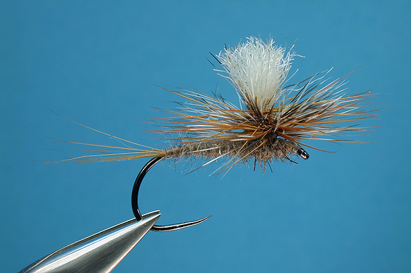 | Hackle: | Brown and grizzly rooster hackle |