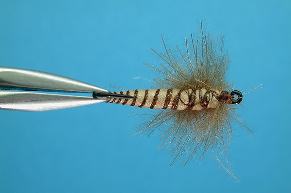 | Hackle: | Beige CDC in a dubbing loop, and wrapped as a parachute hackle |