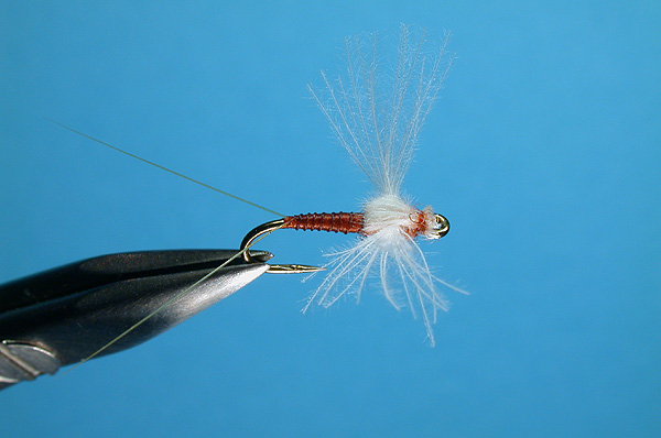 Tying notes:The tip of the CDC feather is trimmed out to get rid of the feather shaft/rachis. The feather is mounted very much as you would a Compara-Dun wing. A bit of thread is placed in front of and under the CDC feather tips to slightly lift them upright. Dub in front of and behind the wing. Push the wing tips back with the thumbnail to split the barbs right and left. While keeping the barbs separated right and left, pull the quill end of the feather over the top, much as a wing case on a nymph. This will separate the barbs side to side and keep them in place. Tie down at the eye. Whip finish and trim off the waste end. The natural ends of the barbs may be left alone or trimmed to a more realistic wing shape. Various synthetics can be combined with the wing (i.e., sparkle organza, Hi-Viz, Micro-Zelon, Z-Lon, etc.) to add a bit of sparkle. |