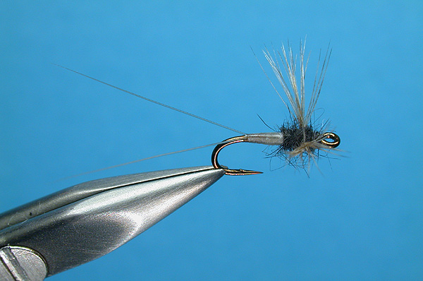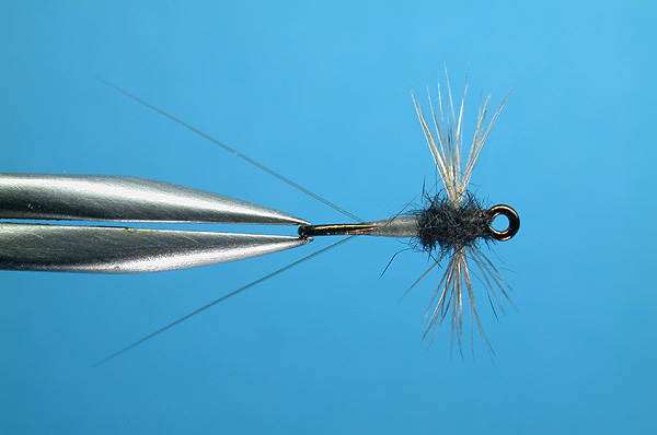 | Loopwing: | 4-5 winds of hackle, color to match natural, gathered with tying thread toward an ultimate shape of fanned wings that lay to either side at about a 120 degree angle to one another |