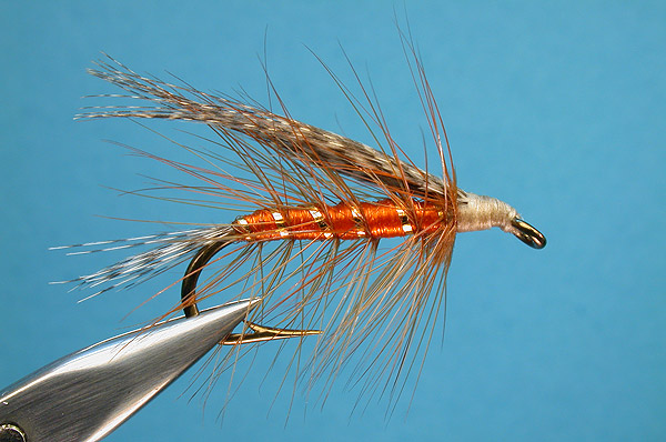 | Body hackle: | Golden Ginger, palmered, with two extra turns for collar |