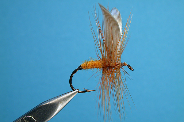 | Hackle: | Brown cock hackle |