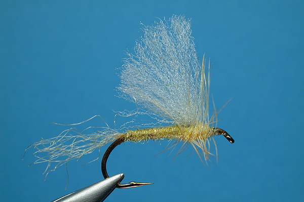 - Tie in a small bunch of olive Antron fibers as a trailing shuck.