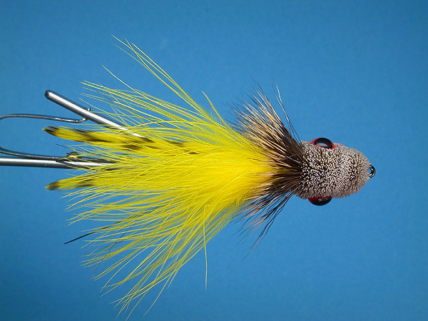 | Tail & wing: | yellow marabou; silver Flashabou under grizzly dyed yellow hackle on the sides of the yellow marabou |