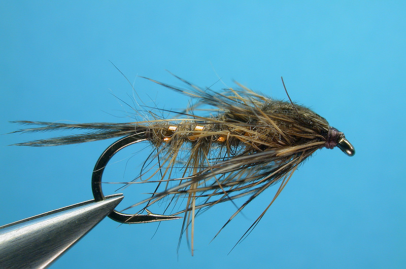 | Wingcase: | mottled side of a cock pheasant side tail feather, tie in as normal but fold back and cut surplus leaving a small stub |