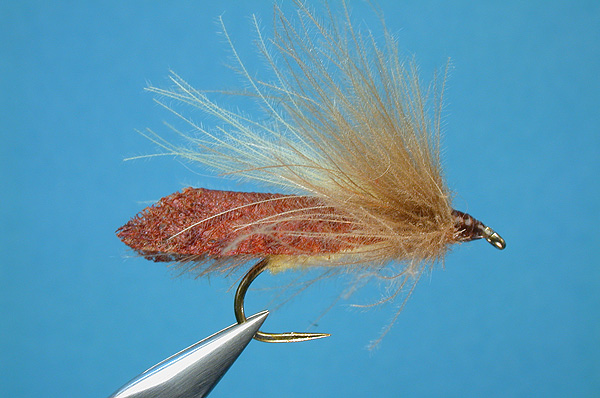 | Hackle: | CDC barbs, brown, in dubbing loop (or split thread) |