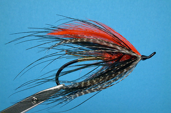 The combination of black and orange with gold flash is very effective for chinook salmon. This fly was created after I had a season full of good luck with a similarly colored hairwing wet fly with a long flashabout tail (Fatal Attraction). I wanted to tie a Syd Glasso style spey fly making use of that effective combination of colors.