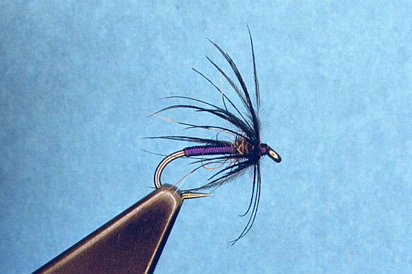 Note: This is one of my favorite flies for summer and early fall trout fishing on smaller freestone creeks near my home. I also carry a similar fly which has a body of peacock herl instead of the purple silk. Both are excellent flies for picking and poking around a stream that has become slow and lazy during the lower flows of summer, especially when suspended beneath a good floating dry fly. Starling skins are cheap and are an excellent source of soft hackles for wet flies.) |