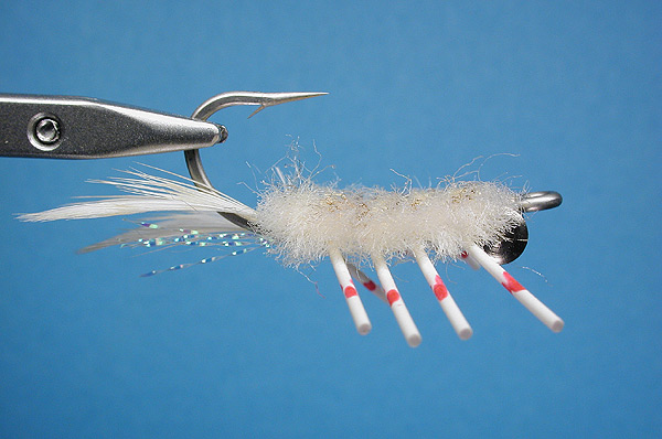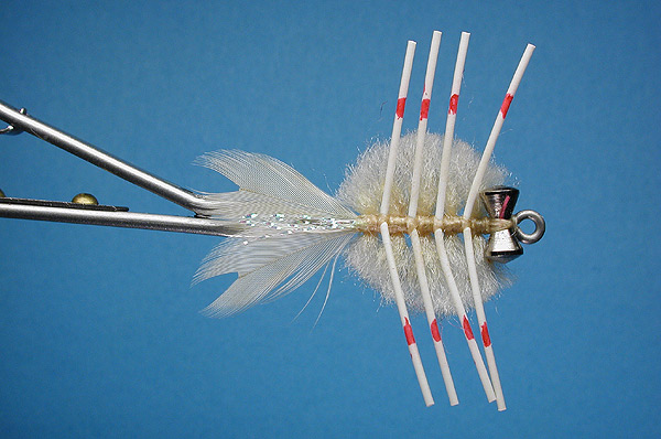 | Body: | Beige yarn hanks (trimmed to shape after fly is completed) alternating with white or natural latex rubber legs |