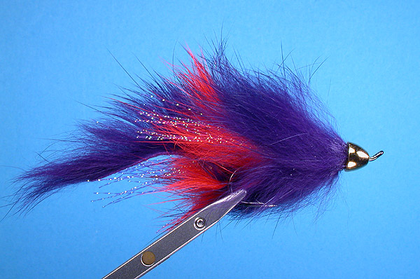 Notes: One of my favorite flies for steelhead. Other colors that work well include pink, orange, tan, electric blue, and black. Whip-finishing twice behind the head will eliminate the need for head cement. Swing it deep, and be prepared for some _vicious_ strikes! |