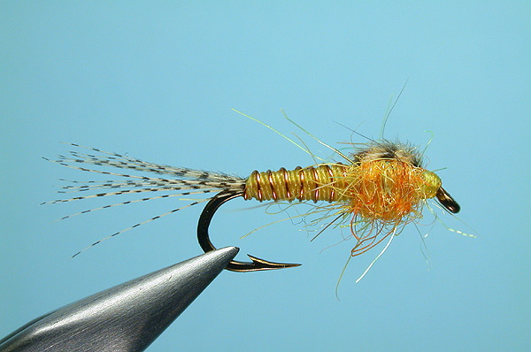 | Thorax: | Amber wapsi Sow/Scud dubbing |