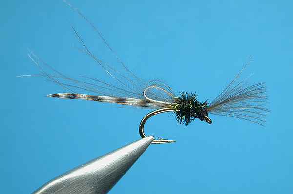 - Tie in body one-third back from eye with several wraps of peacock covering the tie in point of the grizzly hackle point.