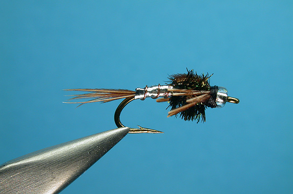 Tying notes: Tied just like a P-tail but with the added step of over wrapping abdomen/body with flashabou for added flash.