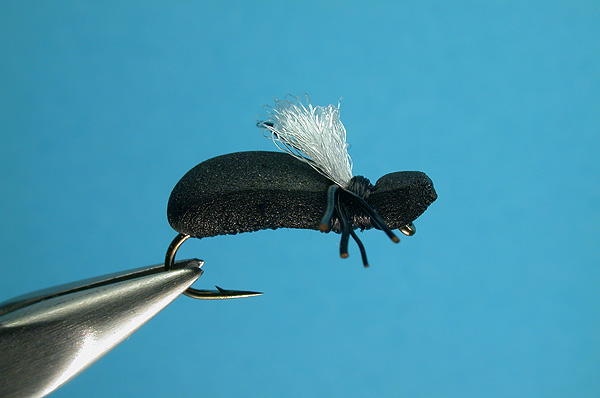 Tying notes: Take foam and singe edges with lighter to give a softer look. Start thread and tie in foam length of hook in tight wraps giving the body a compressed, uniform shape. Work thread back to just behind hook eye and fold foam over making the back. Tie in neck with a couple turns and take 3-4 elk hair fibers and tie on back with figure eight. Elk hair will naturally fan out making legs, trim to length. Take wing material, really just used as an indicator post so you can see a black fly, and tie in. Finish fly and trim excess foam in front of hook eye to make head. Easy and effective beetle pattern that floats well. I have found success with small sizes, 18-20, on small streams. |