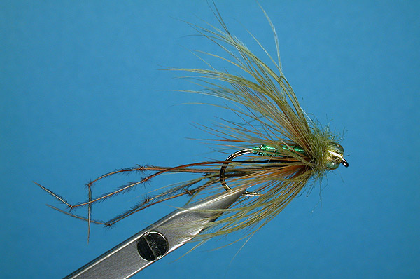 | Hackle: | Webby brown and olive cock hackles, wound together |